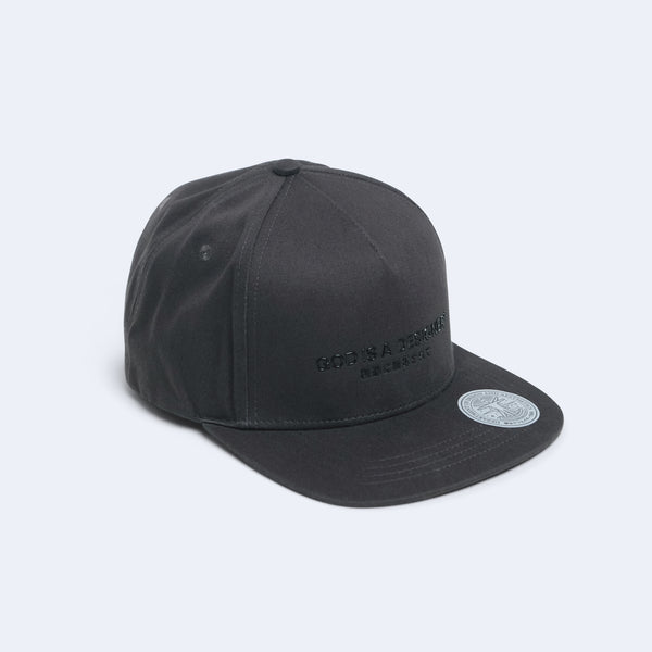Gorra snapback premium de 5 paneles en gris oscuro con el logo God is a designer® en silicona negra. Incluye el sello adhesivo DoDA™ Bureau of Creation en la visera. Forma parte de la cápsula GIAD™ BASE.